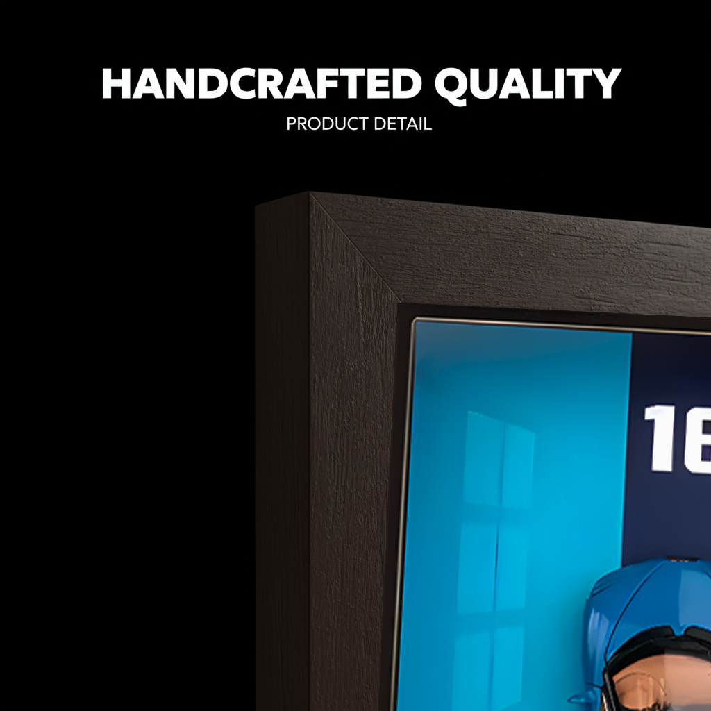 Each frame is meticulously handcrafted with precision and care. Our artisans use premium materials and traditional techniques to create a product that stands the test of time. The rich, textured wood finish and expert construction ensure that every piece is not just a frame, but a work of art that beautifully showcases your passion.